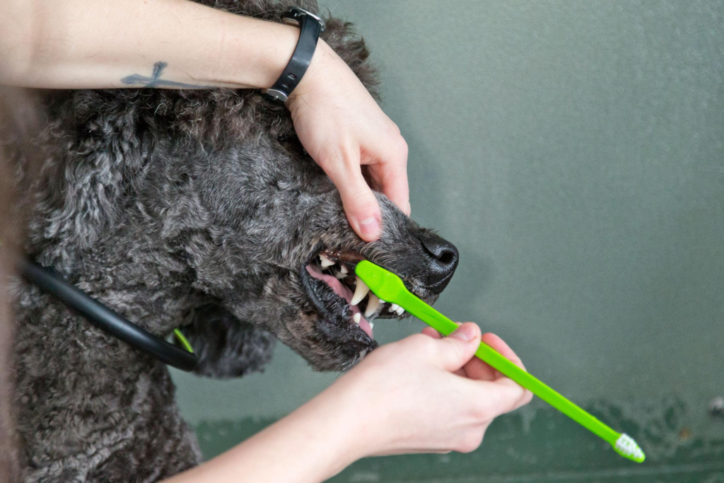 We use single use disposable toothbrushes for each dog, to remove soft plaque, along with pet dental spray. This service cannot remove hardened tartar or stains and will not be offered for extreme build-up on teeth.